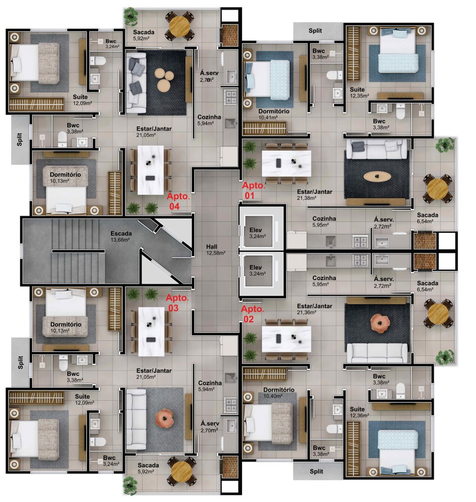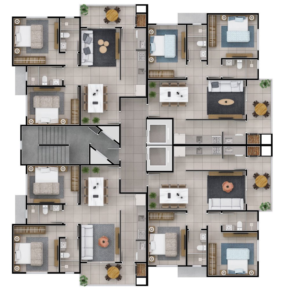 São 2 blocos de apartamentos, com 4 unidades por andar, oferecendo uma rotina mais tranquila e bem organizada. Você chega e já sente a diferença: hall de entrada decorado, 2 elevadores por bloco e a comodidade de garagem privativa, trazendo segurança e aquele alívio de "cheguei em casa" de verdade.